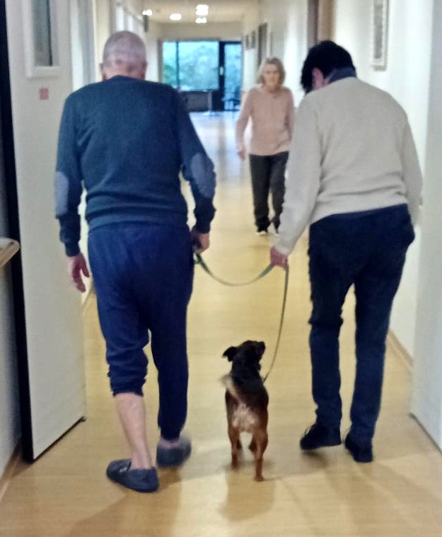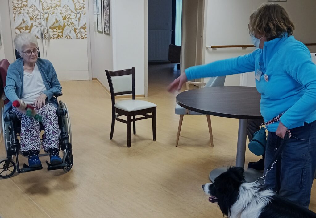 La première séance s’est déroulée le jeudi 9 janvier et a marqué les esprits. Deux bénévoles ont présenté leurs chiens aux résidents de l’Unité Protégée. Les résidents ont fait la connaissance de Tiamo, un border collie, et de Maya, un chien croisé pinscher. Les animaux ont immédiatement suscité l’intérêt et la curiosité. Les résidents ont observé, échangé et partagé leurs souvenirs liés aux animaux de compagnie.