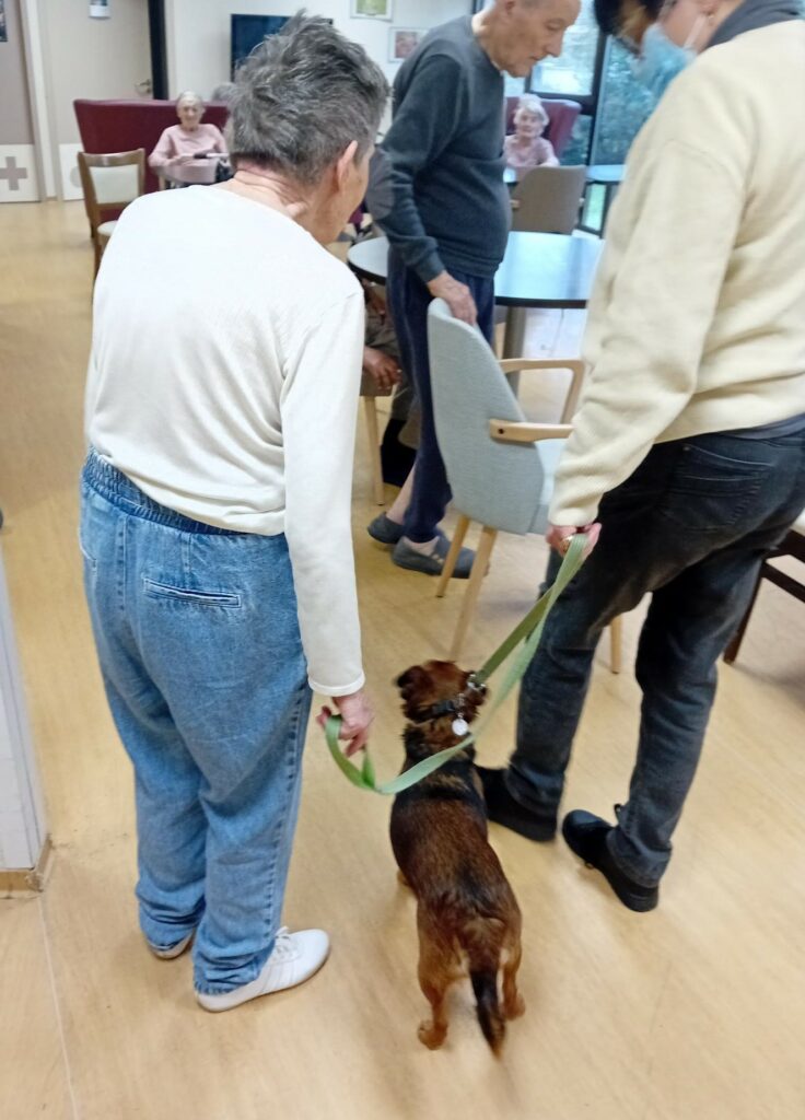 La séance s’est poursuivie par des démonstrations de jeux simples, accessibles à tous. Les résidents ont participé au toilettage des chiens, favorisant le contact et la stimulation sensorielle. Certains ont également profité de petites promenades dans le couloir de l’Unité Protégée, accompagnés des bénévoles et des animaux. Ces moments ont renforcé le sentiment d’apaisement et de confiance. Cette médiation animale illustre la volonté de la Résidence du Bourg, EHPAD à Martignas‑sur‑Jalle, de proposer des animations adaptées, humaines et enrichissantes.