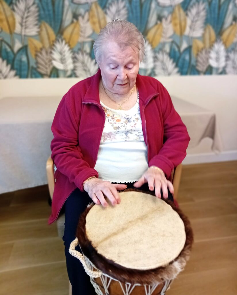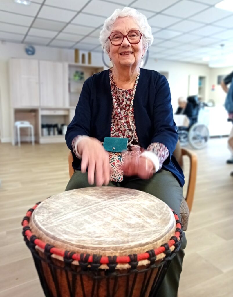 Dans le cadre du projet « Tous en fête ! », la Résidence du Bourg prépare dès à présent le spectacle présenté lors de la fête de l’été, et plus particulièrement un concert de djembé interprété par les résidents. Des ateliers percussions, animés par M. Mamadou Diagne, se déroulent à raison de deux séances par mois depuis le début du mois de février. Ces ateliers favorisent la coordination, la mémoire et la confiance en soi. Ils permettent aussi de créer une dynamique collective accessible à tous.